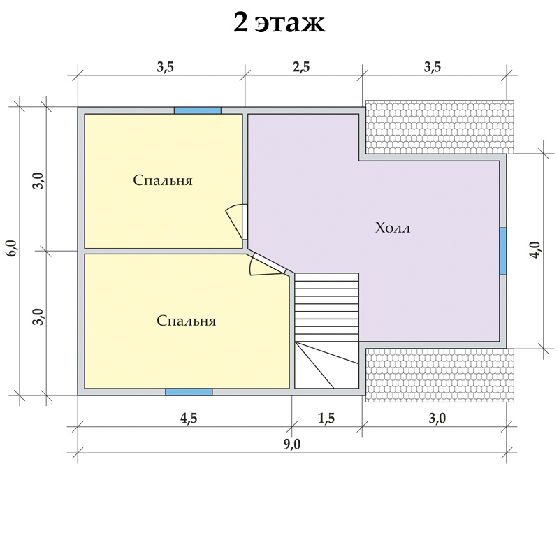 · Далее поднимаемся по лестнице на второй этаж. Здесь проходим по светлому холлу, который можно украсить скульптурами или вазонами с цветами. Поворачиваем налево – и видим две в меру просторные и очень уютные спальни.