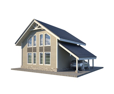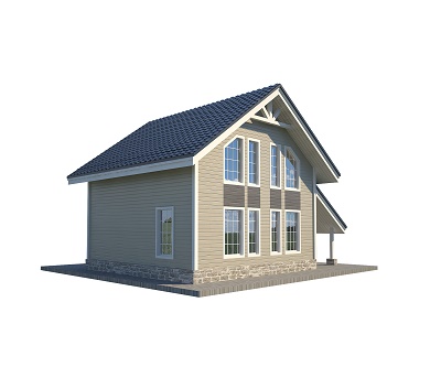 В основании коттеджа – столбчатый фундамент, установленный на бетонные блоки и защищённый от влаги рубероидом. Благодаря каркасной технологии коттедж получается крепким и надёжным, ведь его конструкция снижает нагрузку на фундамент. Крыша дома – скатная, укрыта ондулином. Для защиты от протечек используется мембранная гидроизоляция. Полы выложены из OSB-плит и утеплены слоем в 100 мм. Высота потолков в доме составляет 2,4 м на первом этаже и 2,3 м – на мансардном.