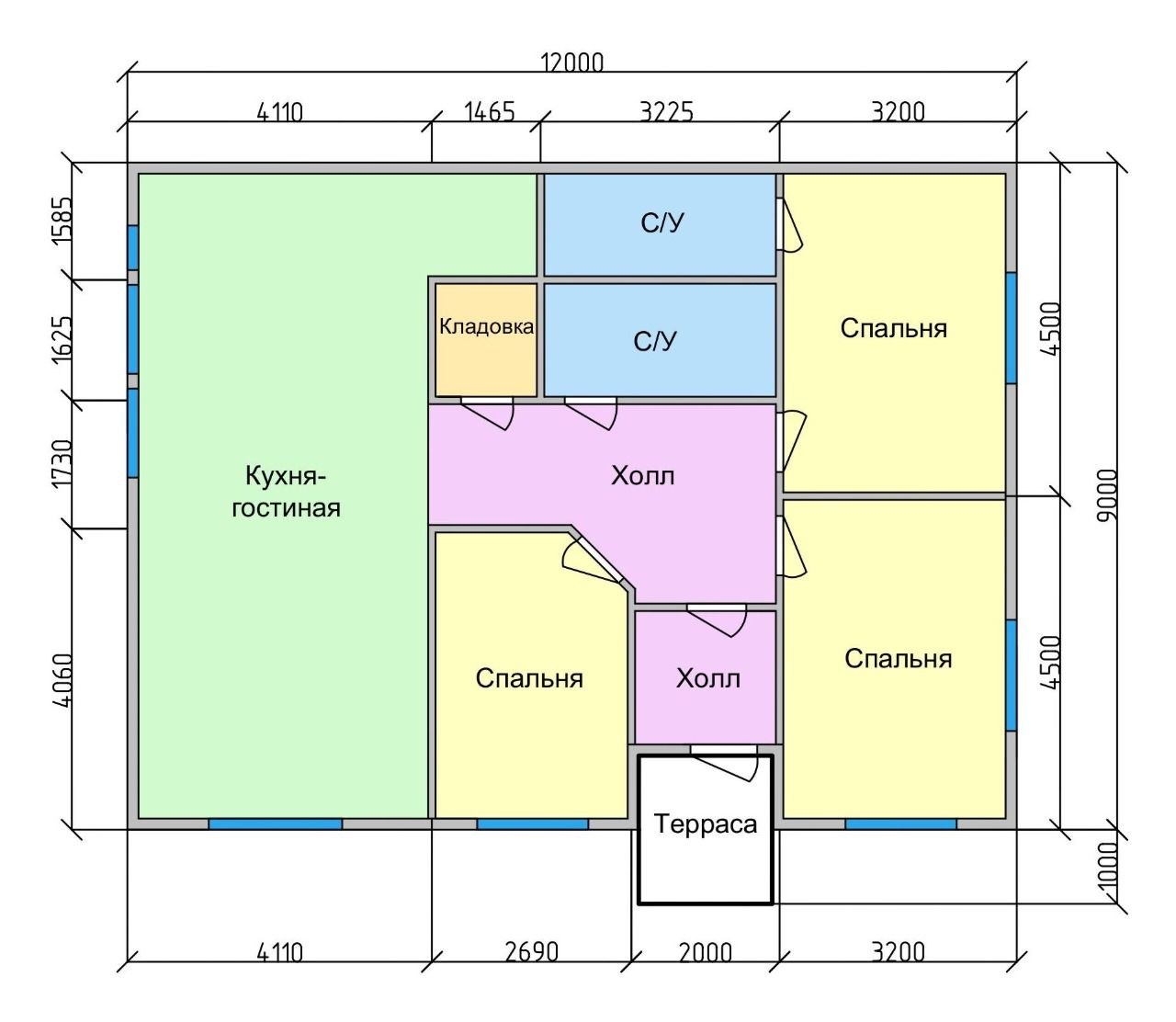 Дом общей площадью порядка 100 м² начинается с уютной террасы, которая станет излюбленным местом летнего отдыха для всей семьи. С террасы вы попадаете в просторный холл, выполняющий роль логистического центра. Слева от него расположена светлая кухня-гостиная с большими окнами, наполняющая пространство воздухом и дневным светом. В приватной зоне дома разместились три спальни, обеспечивая личное пространство каждому члену семьи. Для максимального удобства предусмотрены два раздельных санузла (С/У) и вместительная кладовая. Продуманная система холлов сохраняет полезную площадь и обеспечивает удобную навигацию по дому.